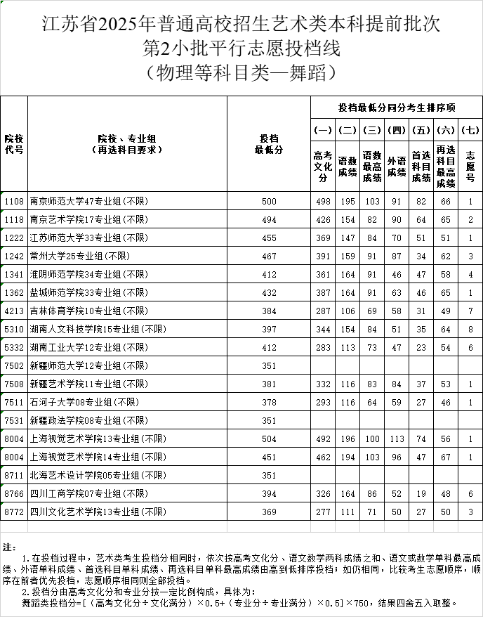 江苏省2025年普通高校招生艺术类本科提前批次第2小批平行志愿投档线