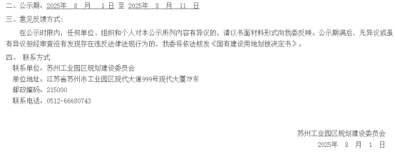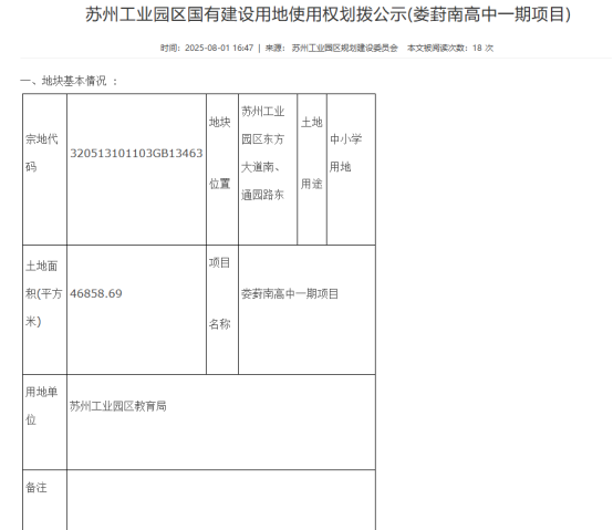 项目位于苏州工业园区东方大道南、通园路东,土地用途为中小学用地,土地面积46858.69平方米,用地单位为苏州工业园区教育局。公示期为2025年8月1日至2025年8月11日。