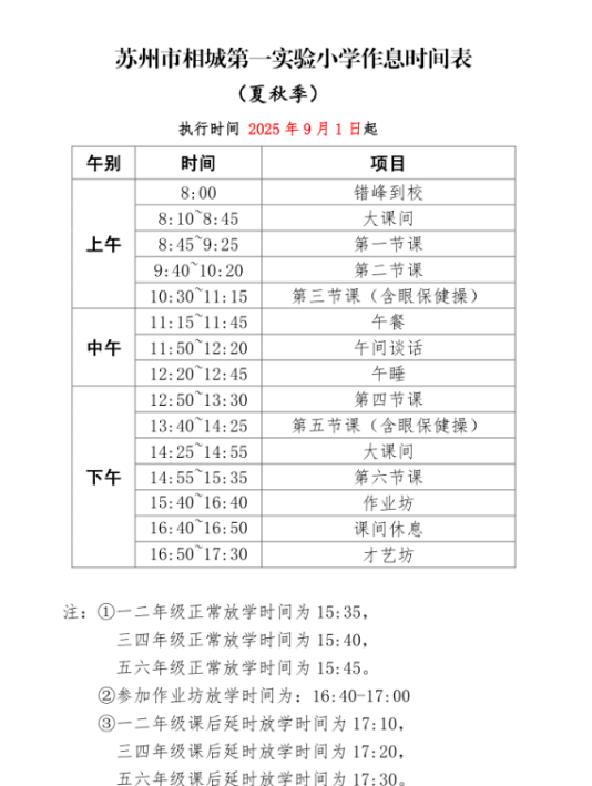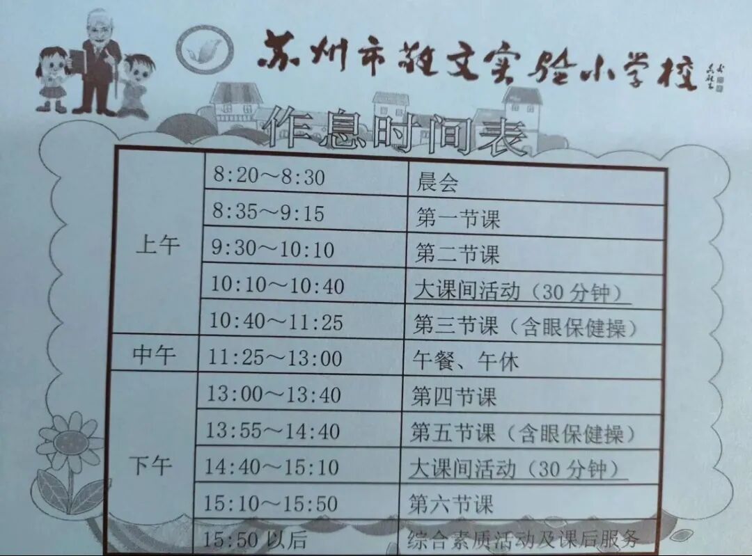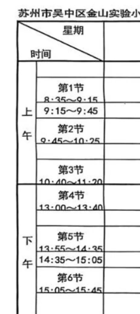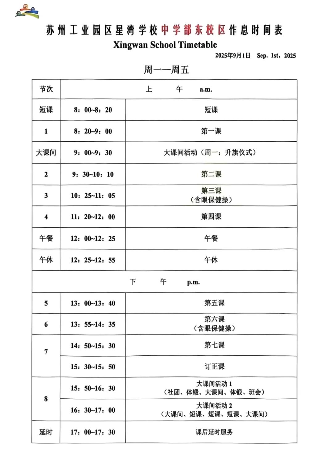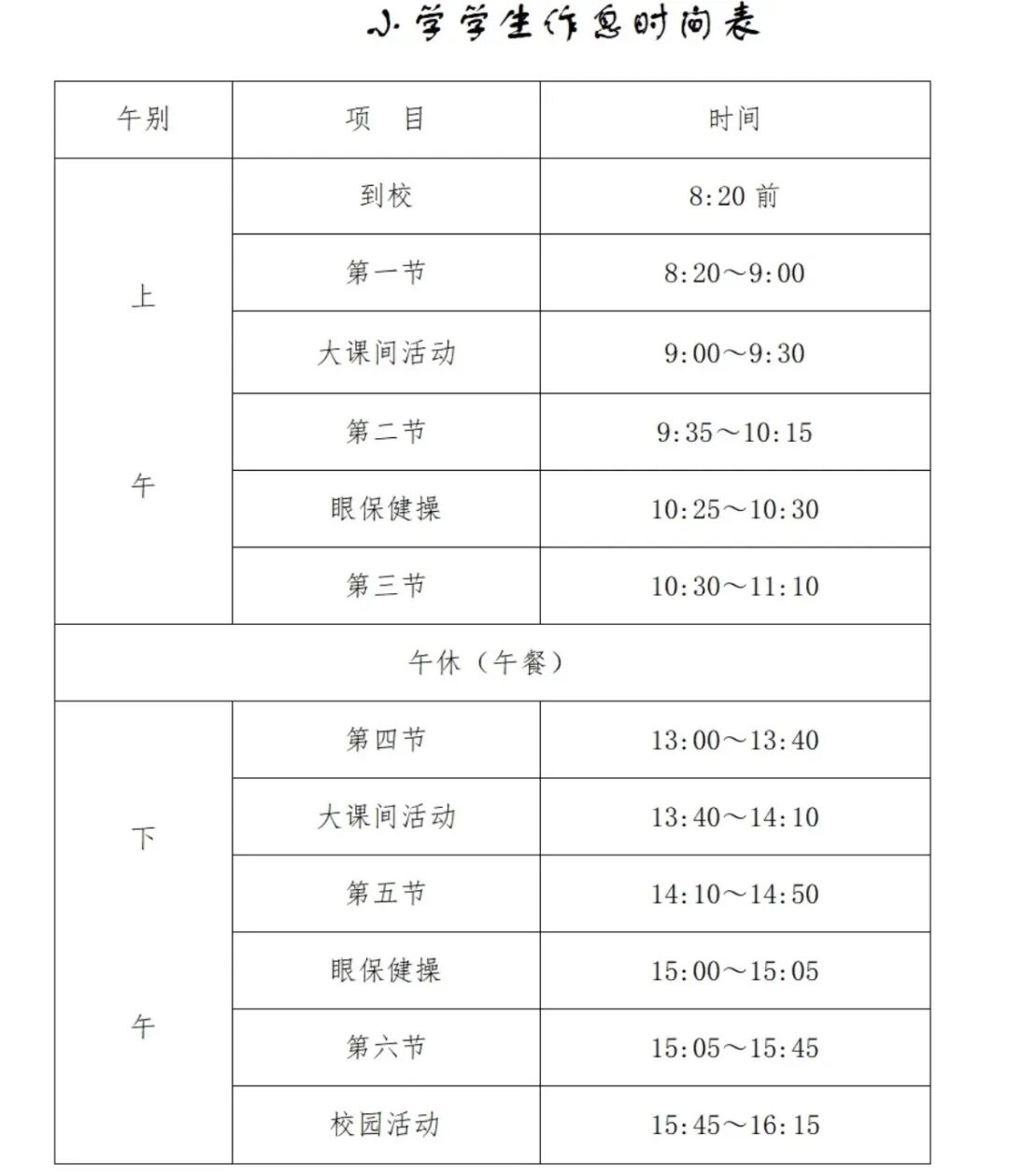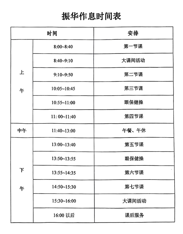 早上7:30-7:40到班,第二周开始延时班,各班分流放学,时间在17:10-17:20区间。