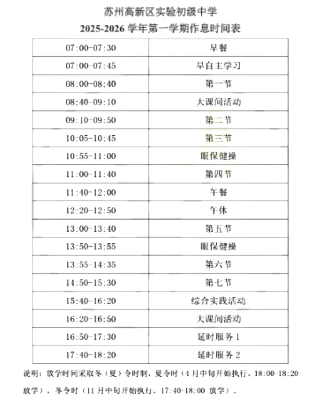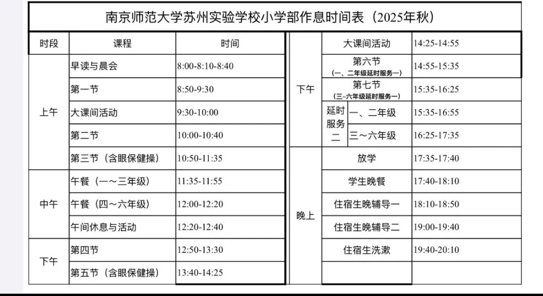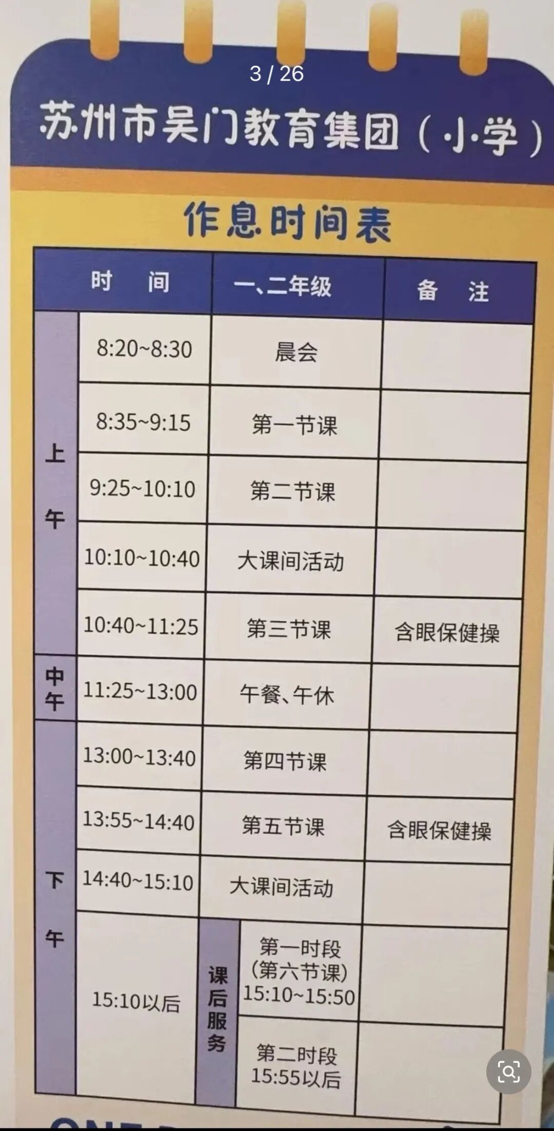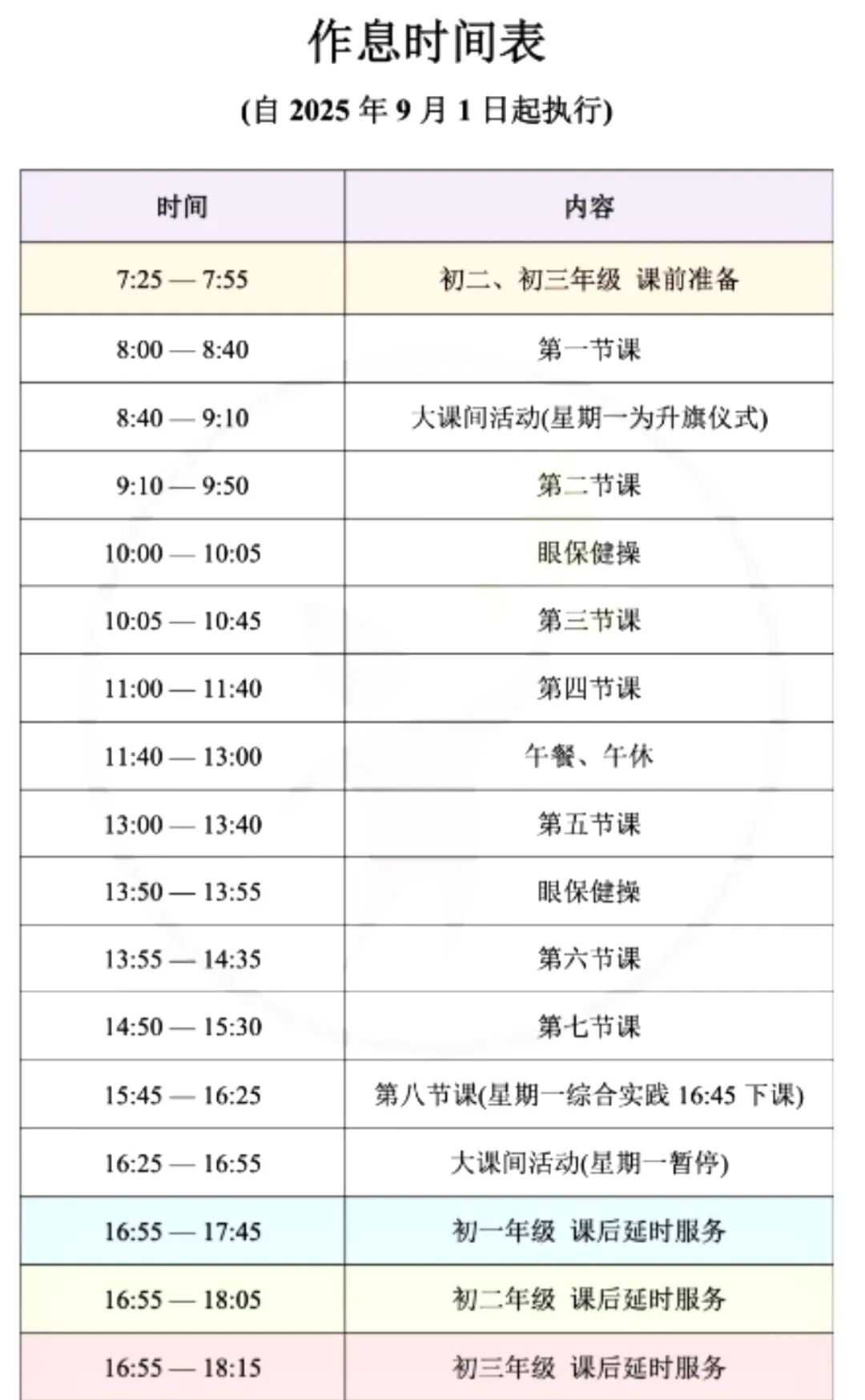 早上7:30-7:40到班,第二周开始延时班,各班分流放学,时间在17:10-17:20区间。