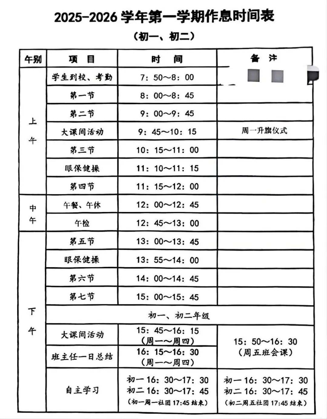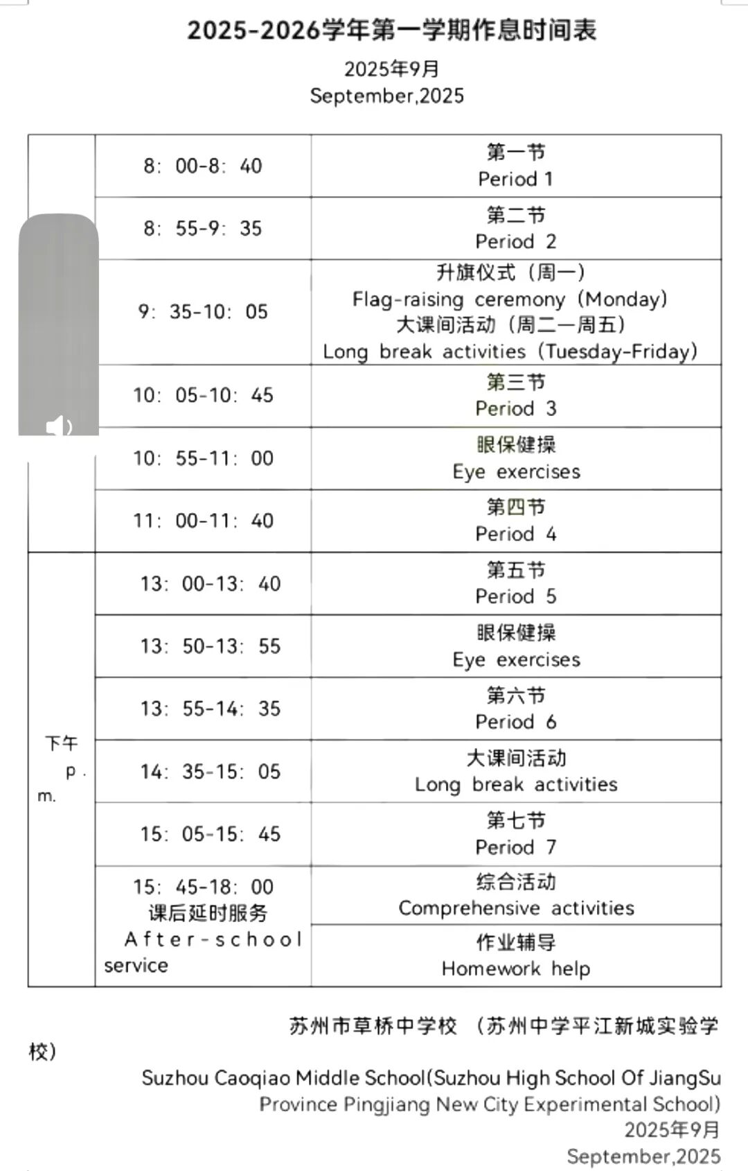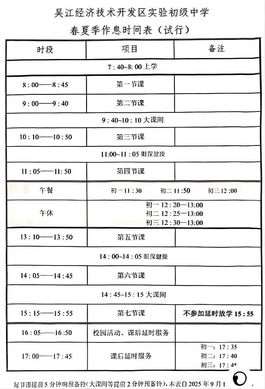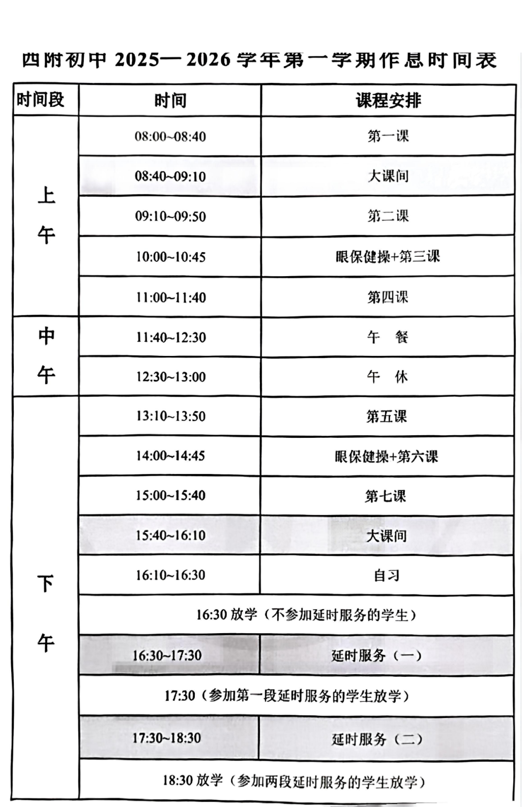 早上7:30-7:40到班,第二周开始延时班,各班分流放学,时间在17:10-17:20区间。