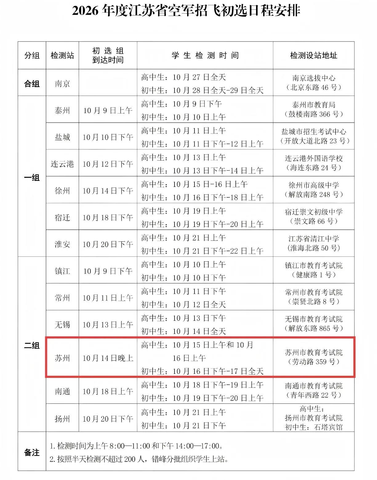 根据2026年度空军招飞工作安排,10月9日至10月22日、10月27日10月29日,空军招飞局南京选拔中心将派初选组赴各地市,对报考空军飞行学员和江苏省空军青少年航空学校的学生进行检测。