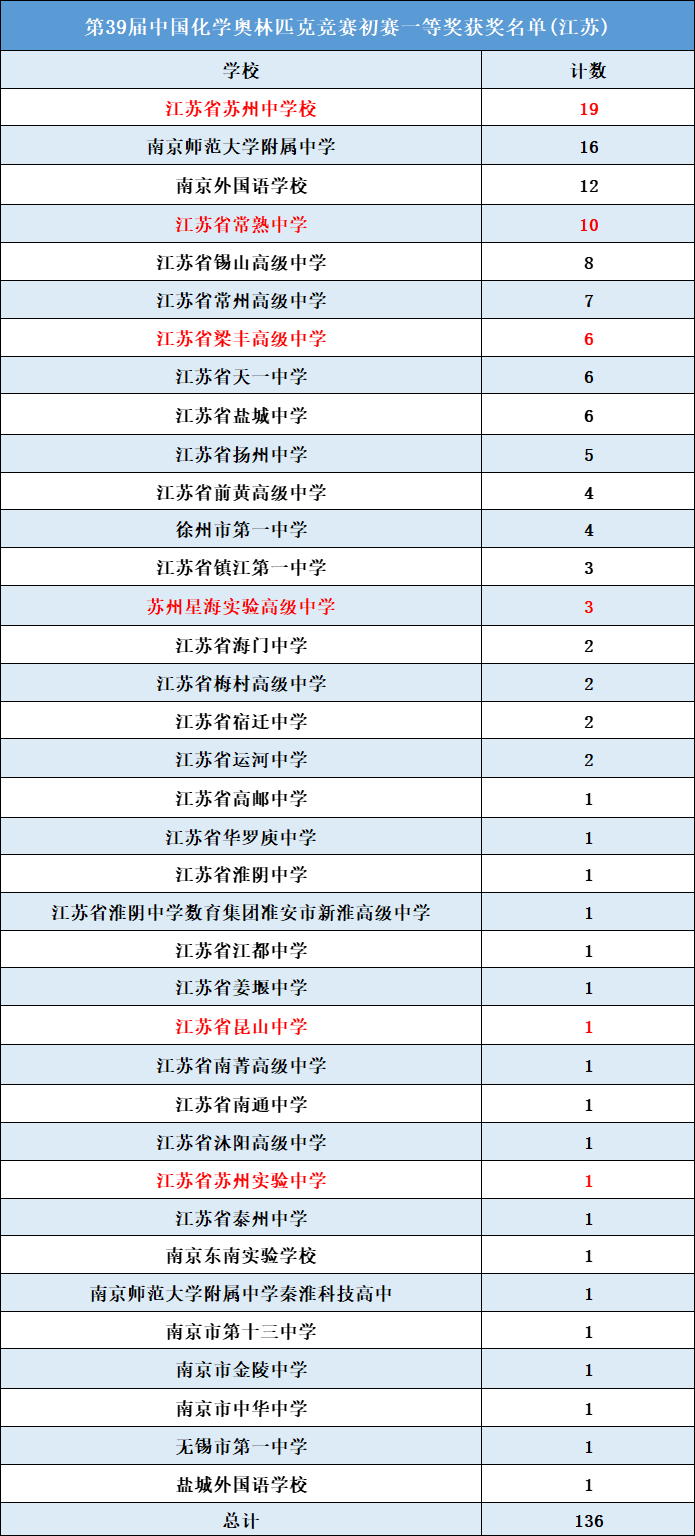 第39届化学竞赛初赛省一名单公布,苏高中全省第一,苏州6所高中上榜