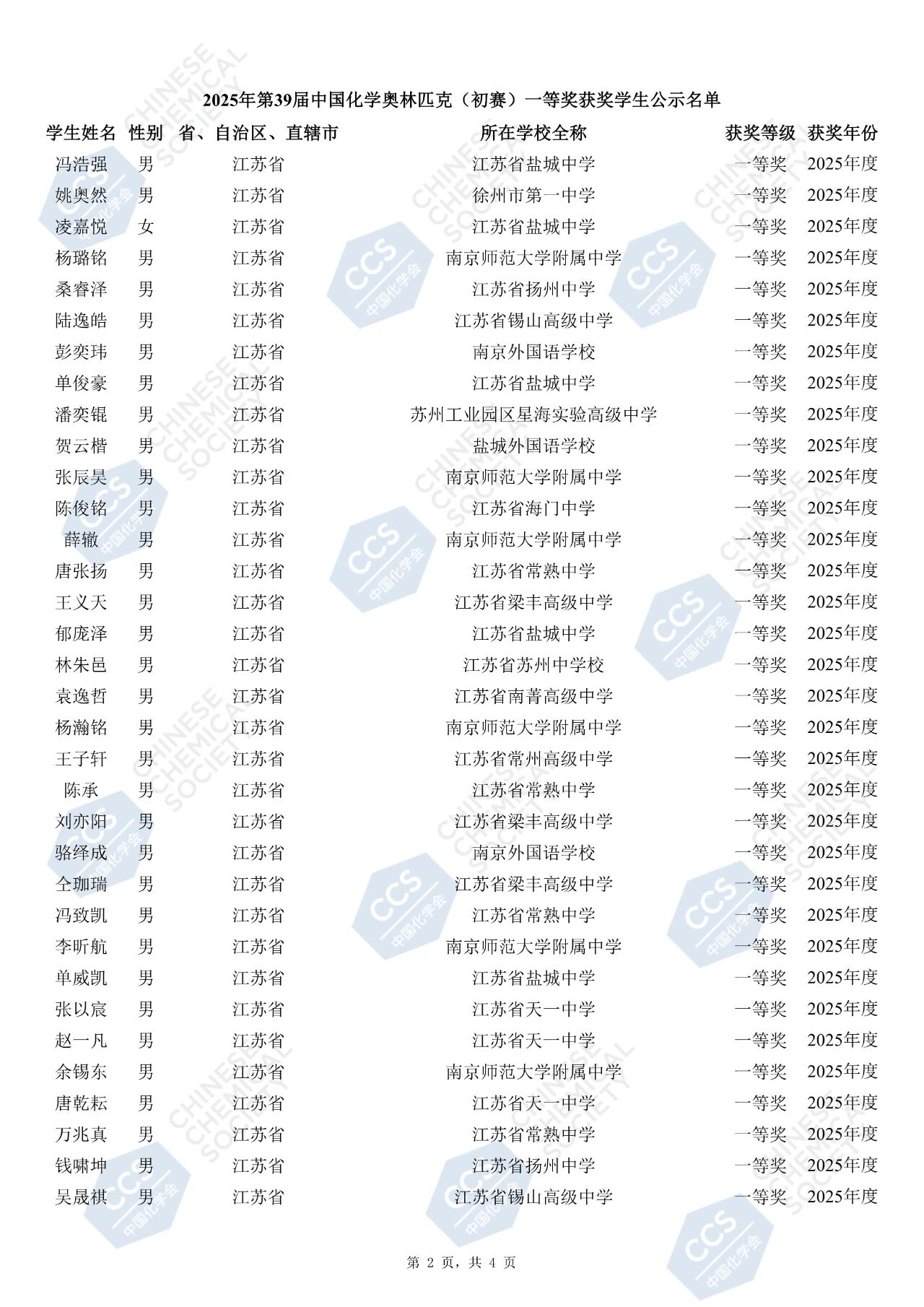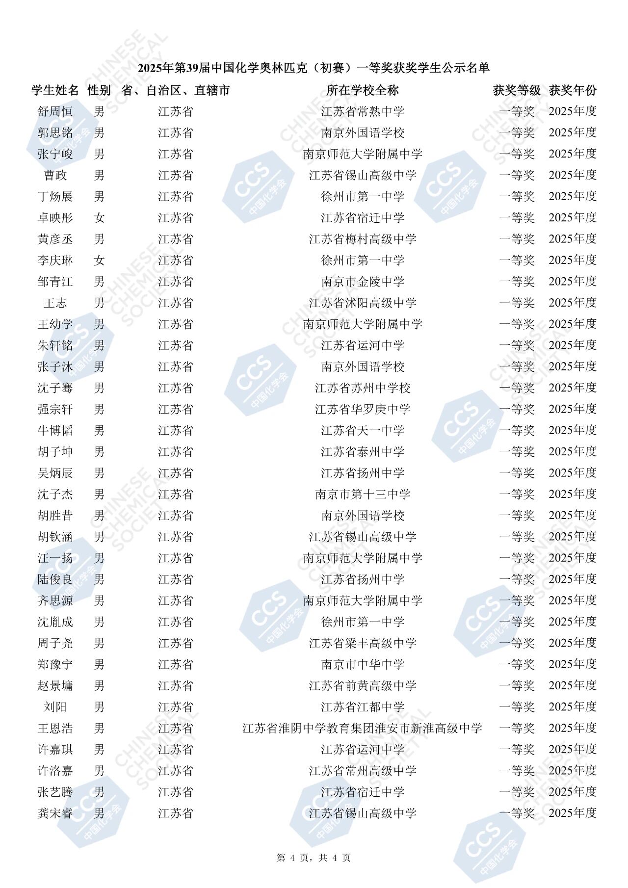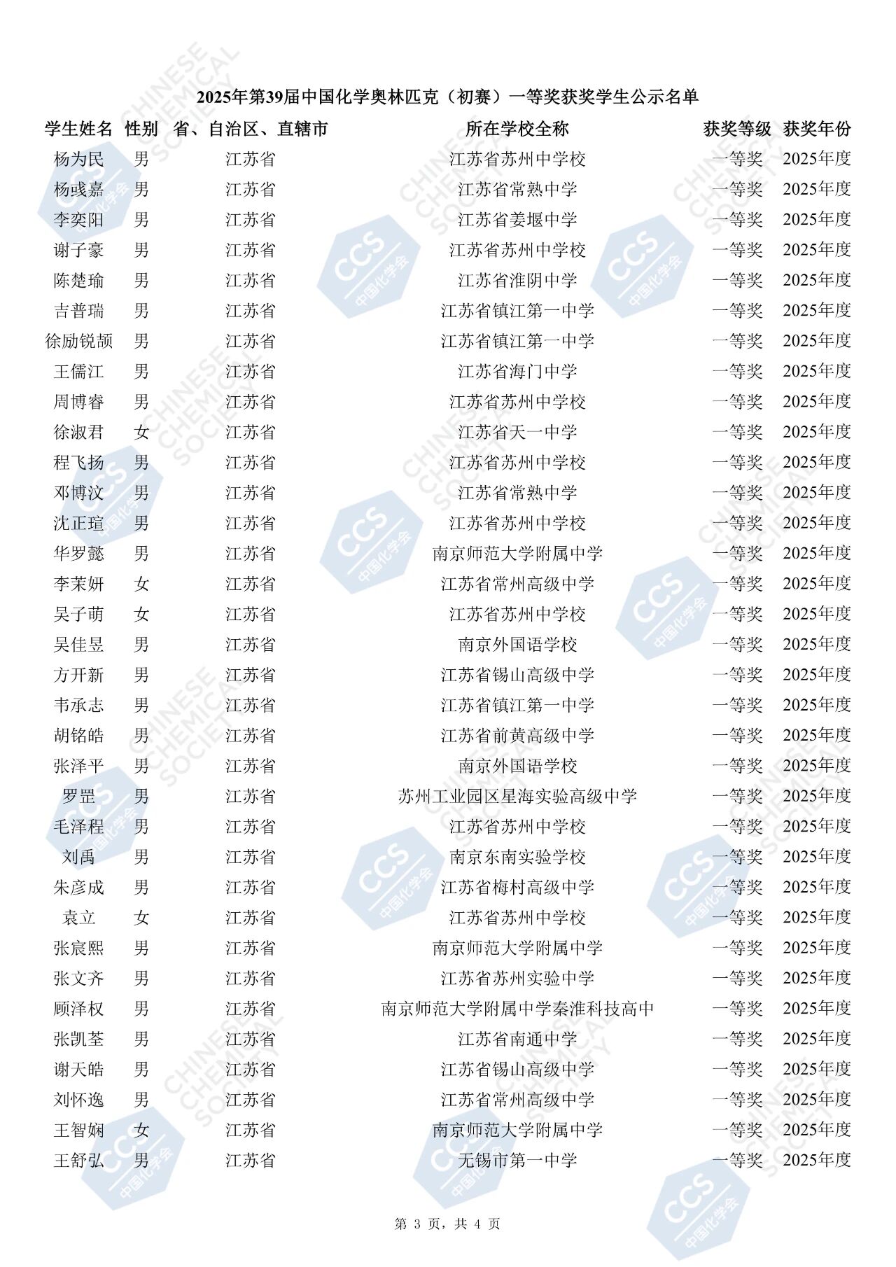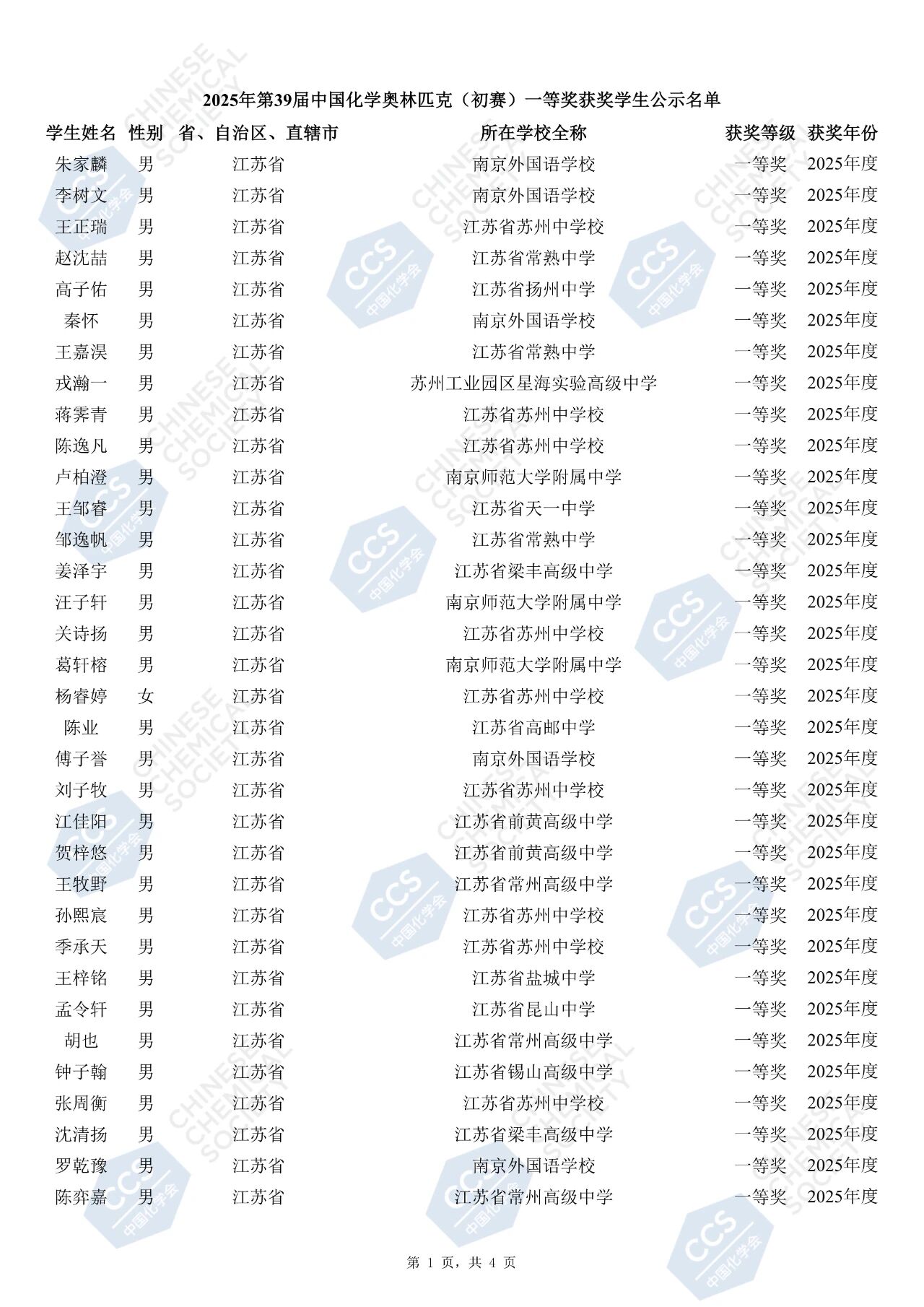 第39届中国化学奥林匹克竞赛初赛一等奖获奖名单公布(江苏)