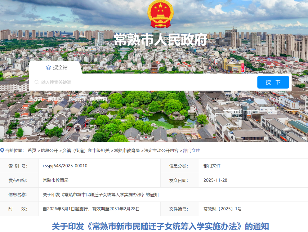 常熟取消积分入学!全面实施“统筹入学”,只看居住时长+社保时长,2026年3月开始申请