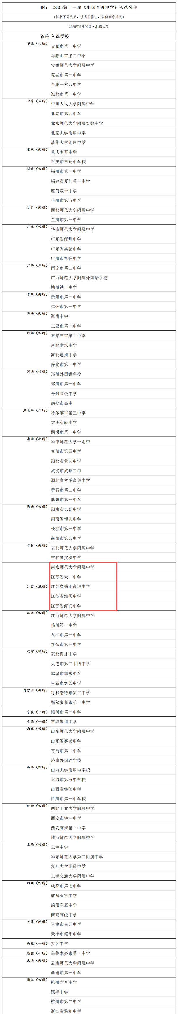 江苏5所学校上榜,分别是南京师范大学附属中学、江苏省天一中学、江苏省锡山高级中学、江苏省淮阴中学、江苏省海门中学。