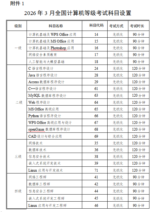 2026年3月(第77次)全国计算机等级考试将于2026年3月28日至30日举行,现将报名有关事项通告如下。