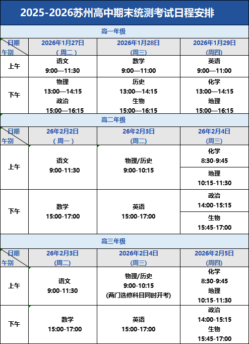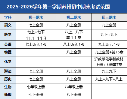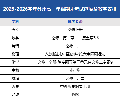 2026江苏苏州初高中最新期末时间&考试范围出炉
