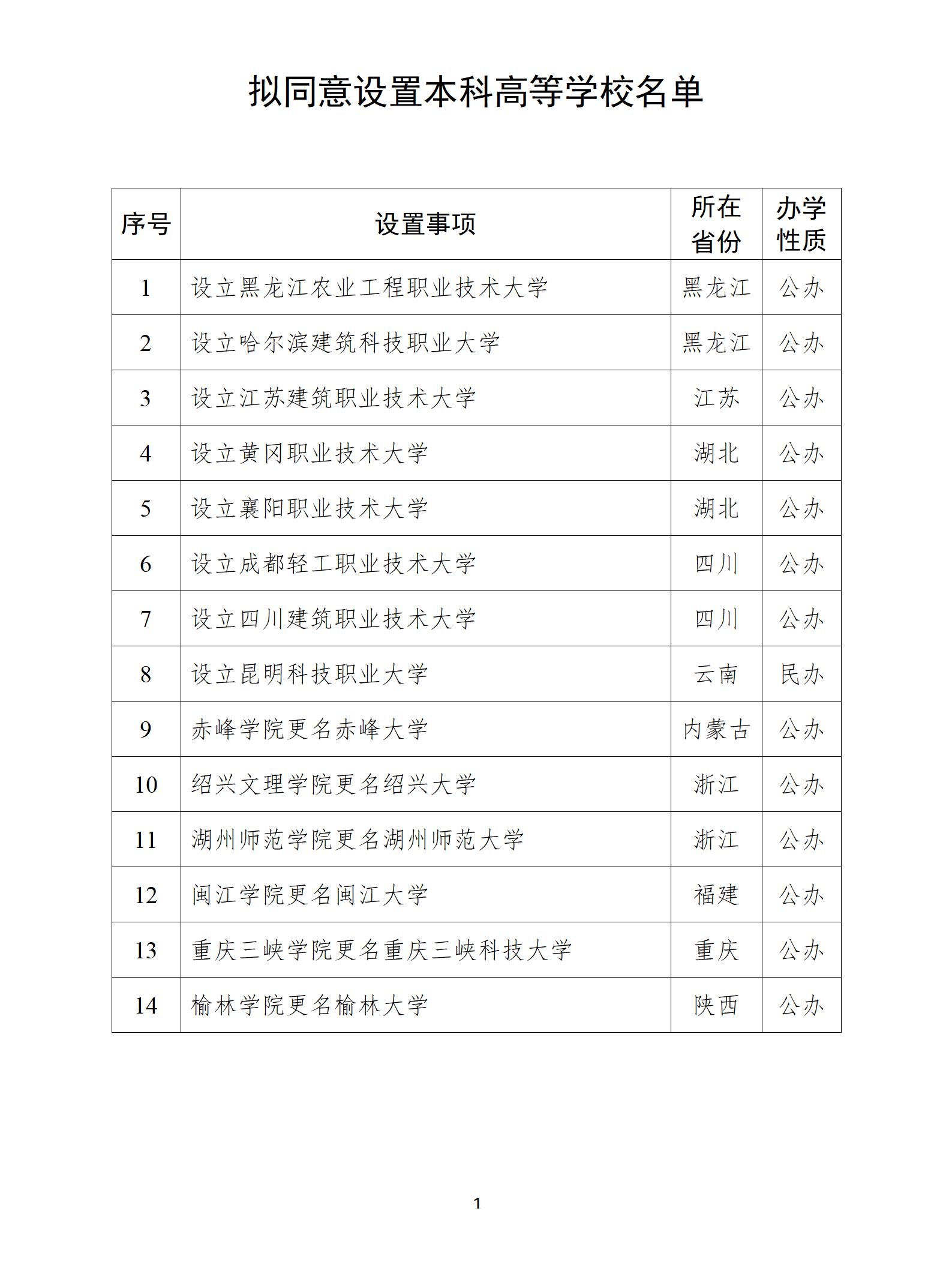 近日,教育部网站发布《关于拟同意设置本科高等学校的公示》,拟同意设置黑龙江农业工程职业技术大学等14所学校。