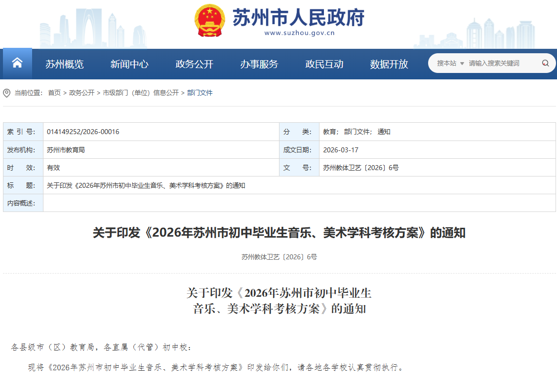 2026年苏州市初中毕业生音乐、美术学科考核方案
