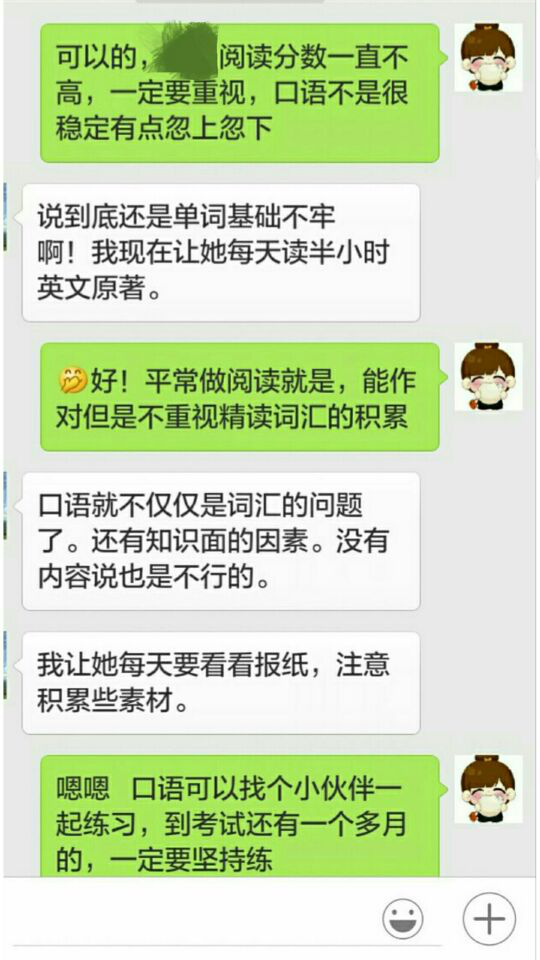 学员在整个上课的过程中都是属于非常认真配合的类型,作业会及时提交,有疑问也会在课间与老师沟通互动,属于主动积极学习型。学生的语音是比较典型的英音,但是语调相对来说会比较平,我在预备段教她语音语调的时候,就慎重提过这个问题,并且给她安排了英语配音的跟读模仿练习去改善,所以语调的问题发现的早,虽然不能彻底解决,但是相比之前要有改善,并且学生已经有了在考试的时候注意的意识。学生的想法是非常独特的,所以在答题的时候总是会有些让人耳目一新的小点子,是非常容易引起考官的注意的,所以这点是自身的一个优势。我还记得学生在一开始上强化段的时候,不太会细节拓展,所以内容相对来说不是很充实,但是后来在上课的时候经过对不同题型的思路分析和引导,学生领悟力不错,慢慢在不断尝试中逐渐改善。很欣慰,她最终能有这样的成绩,平时的努力和考试的时候的淡定发挥是她这次成功的关键。