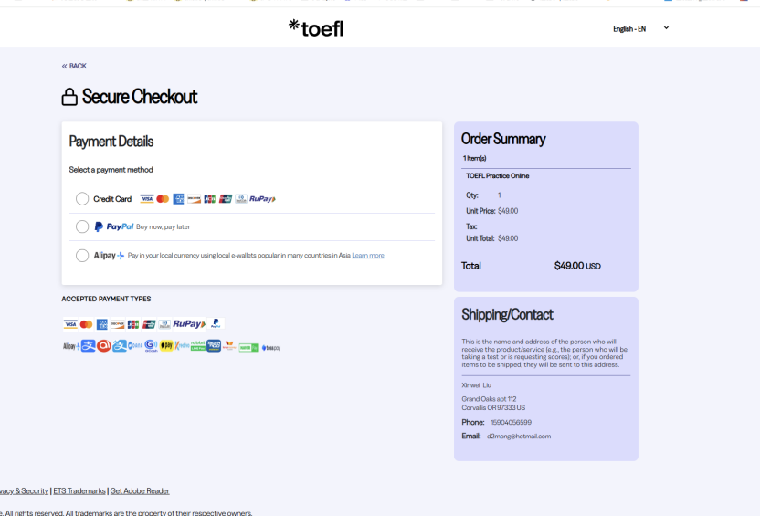 选择TOEFL Practice Online–$49.00 US