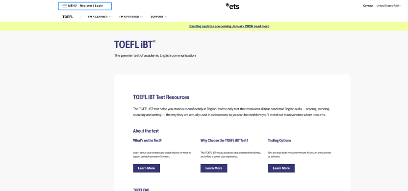 首先,打开托福官方网站(网址:https://www.ets.org/toefl/test-takers/ibt/about.htm),点击页面左上角的“Register / Login”按钮。若遇到“Access Denied”提示,建议尝试切换Chrome浏览器账号或使用合规网络加速工具后再次尝试。