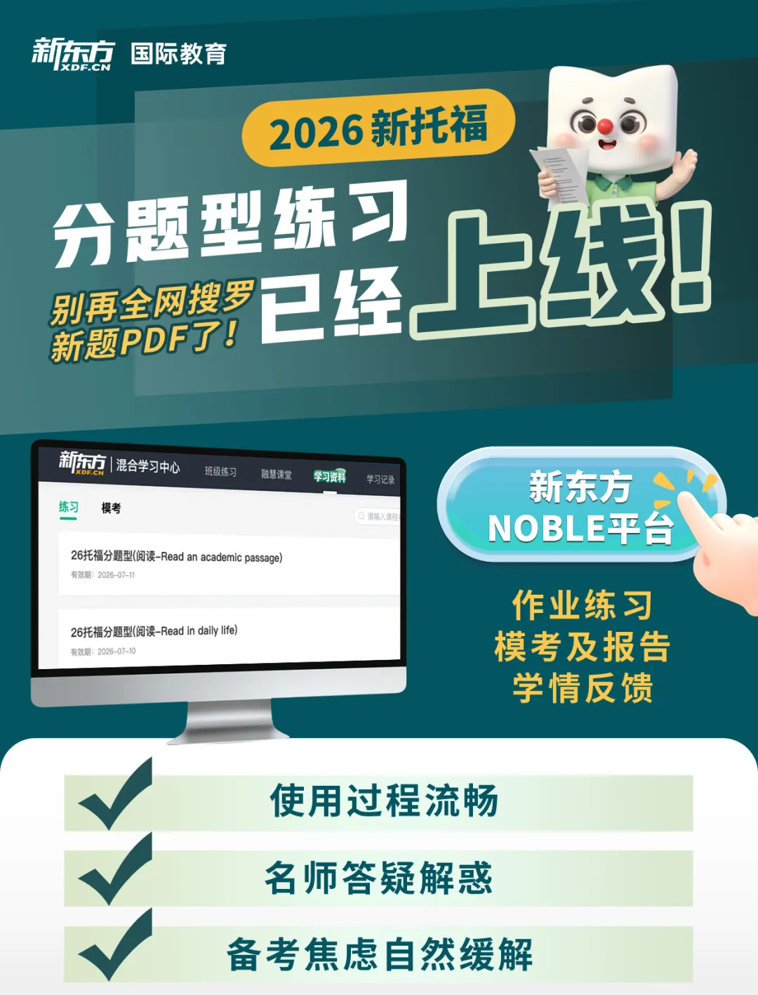 为了帮助同学们更直观、更便捷地了解新托福考试,新东方NOBLE平台正式上线了针对新托福的题型练习与模考训练,让大家抢先体验、提前适应新的考试模式与答题节奏,文末扫码即可免费预约体验!