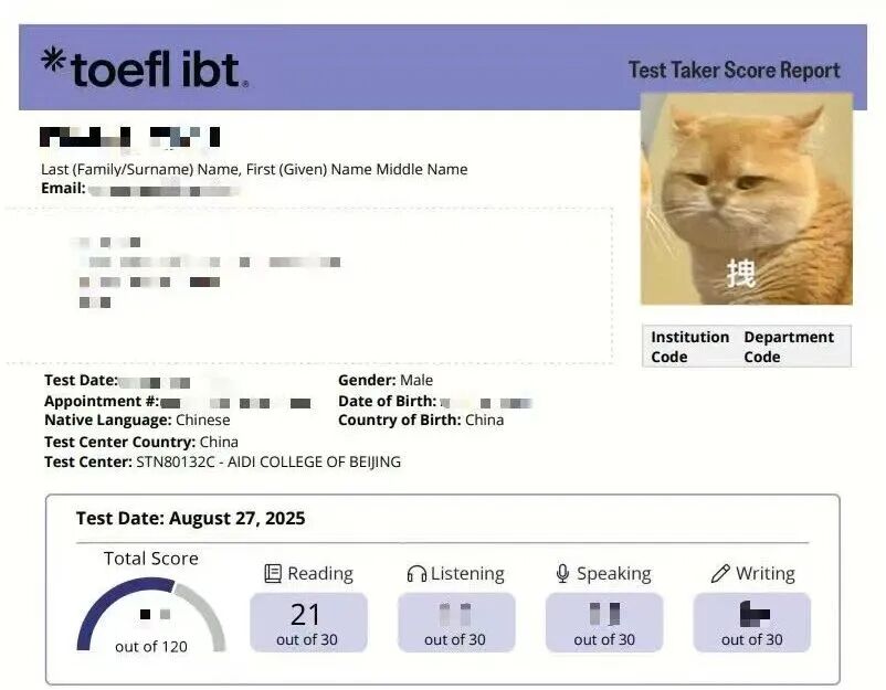 7月23日,Alex参加了托福正考,阅读出分21分,他说没跟你吹牛吧,我说太震撼了哥们儿,点进去看了三遍才确认是真的。但回顾他后来的状态,也觉得是意料之中。因为他所有的技巧都已经以一种“非常信任”的态度熟练运用了,更重要的是他也学会了如何对错题进行非常详细的总结分析,把当时错误的想法大胆的说出来并在潜意识里记住。我相信保持这样的状态,他还会在未来取得更高的分数,我们的约定是30分。