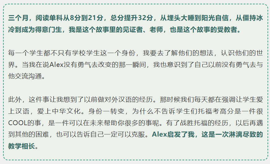 现在想来,当时的我是一种错误的、未经思考的处理,我只相信学生外表所投射在我心中的印象,甚至没有去做了解并走进他思想的尝试。在他愿意尝试参与课堂的时候,我没有看到转变的契机。班课结束,Alex的出班测阅读考了8分。