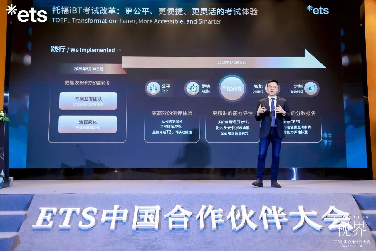 ETS全球托福考试总经理Omar Chihane官宣两大利好:2026年托福iBT考试将围绕“公平、灵活、智能”全面升级,听力阅读引入自适应设计,评分标准对标CEFR,等级划分更清晰;同时,ETS深耕中国市场40余年首次推出的托福教师认证项目落地中国,认证教师可享官网公示、专属资源等权益,且需每2-3年完成进阶考核。