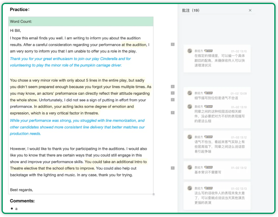 用学术讨论的举例逻辑练习邮件扩写,强化“讲故事”的细节展开能力。