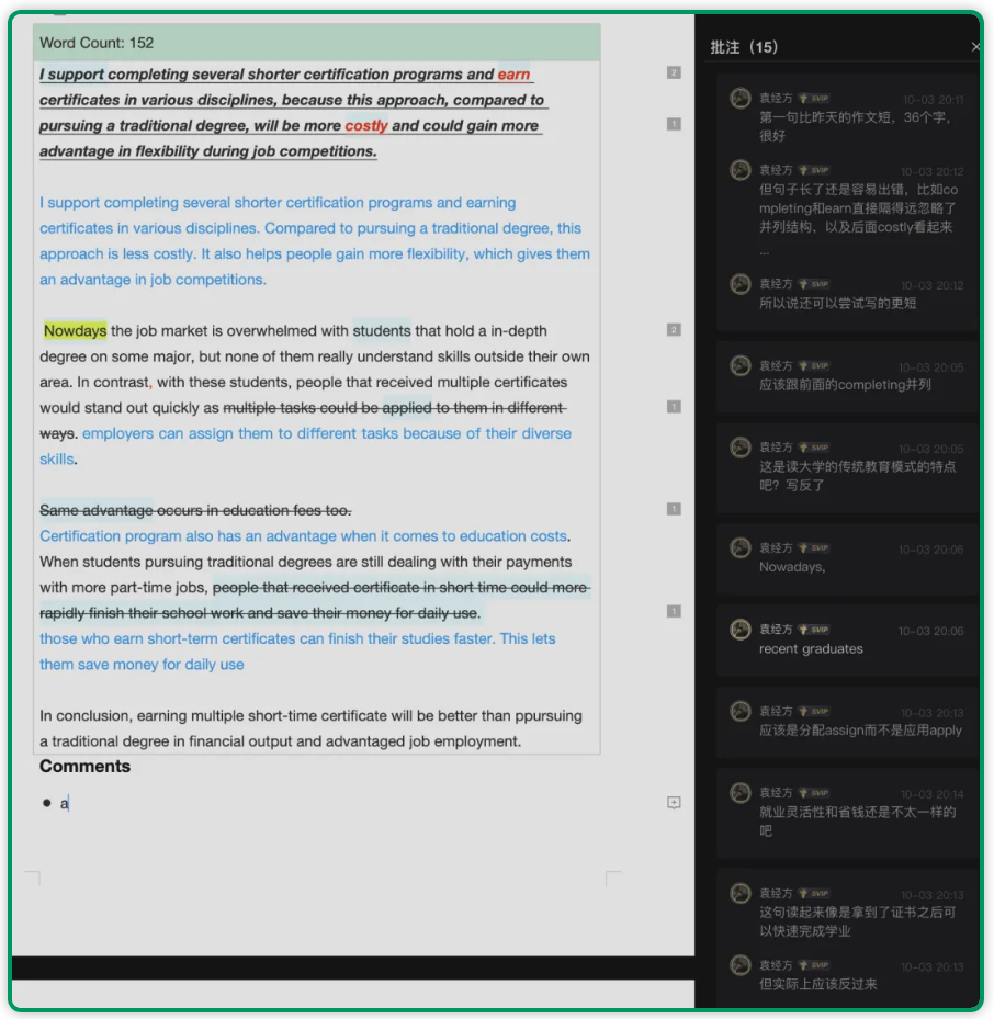 Mandy的高分冲刺很有借鉴意义:2025年10月12日入班时写作27分,凭借扎实的语言功底,仅用1个月(11月15日)就冲刺到满分30分。她的核心问题是冲刺段学员的典型痛点——语言能力过硬,但对考试理解有偏差:学术讨论题中观点设计过于复杂,花大量篇幅铺垫背景却迟迟不切入正题,导致时间不够写不完;还存在部分表达方式记错、表达不地道的隐性问题,成为满分路上的“拦路虎”。
