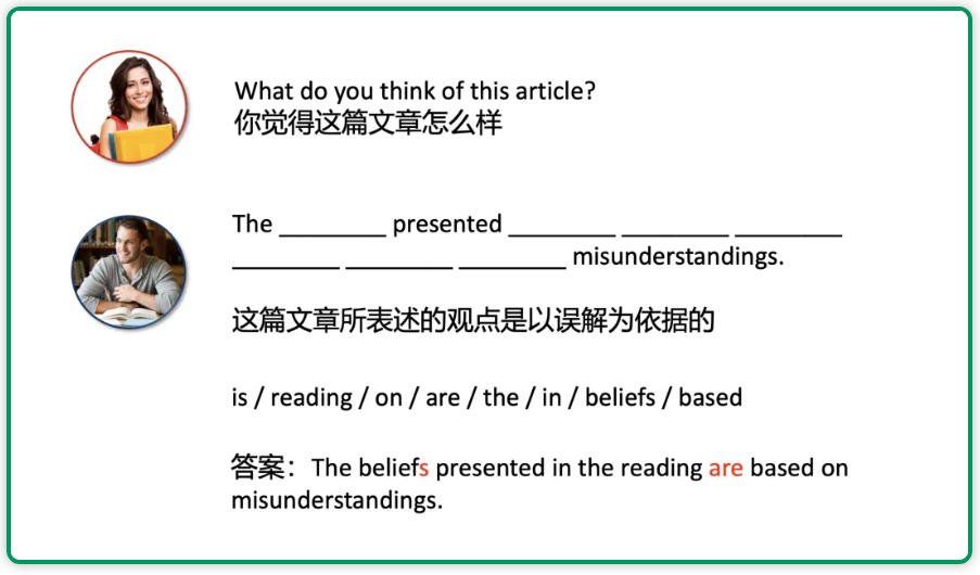 新托福的句子排序题中就重点考察了基础段同学在写作中的常见错误——主谓不一致。上图中的题目的核心考点就是——判断句中的be动词应该用来衔接对“观点beliefs”的描述还是衔接对“文章reading”的描述。