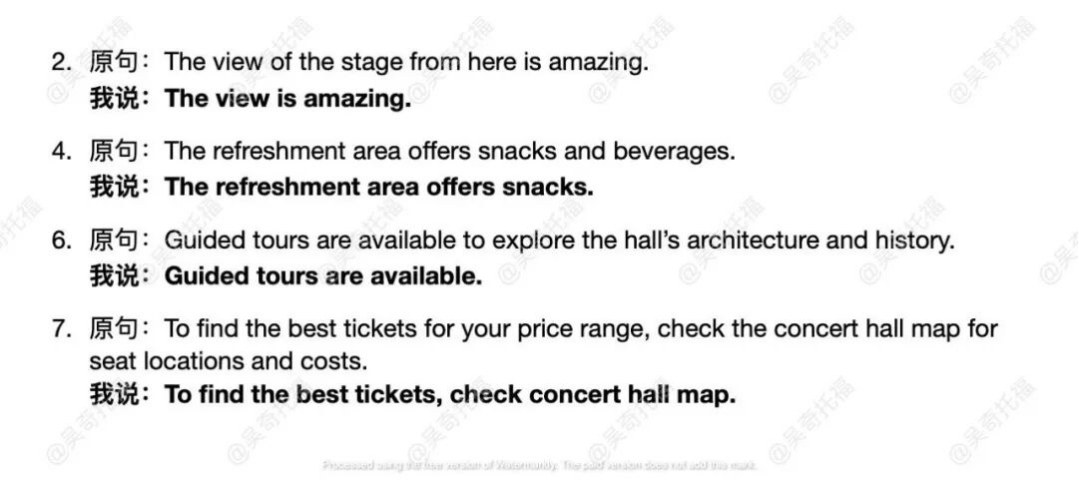 于是,为了验证这一点,这次考试中,我对大多数句子的处理方式都非常一致:我只保留主干,刻意删掉修饰成分。在7个句子里,最短的一句,我只用了4个词;最长的一句,也只有9个词。