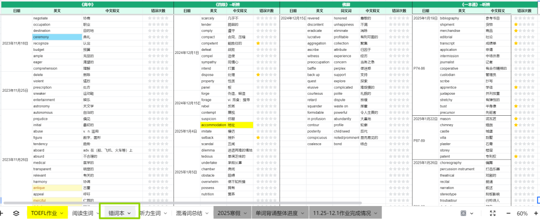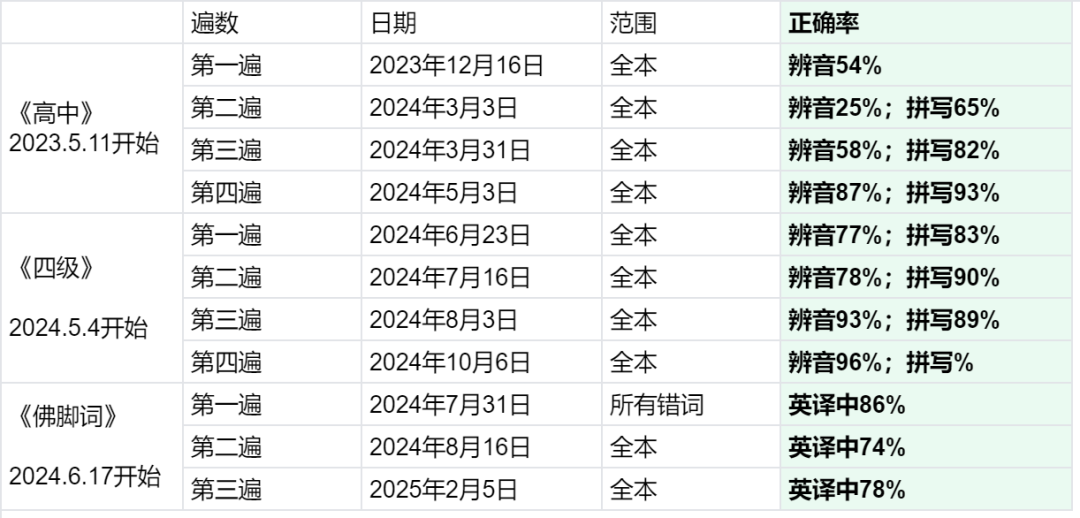 从单词背诵进度和错词本的记录来看,变化是肉眼可见的:每一遍的完成时间都在缩短,正确率都在提高,错词总结越来越少。