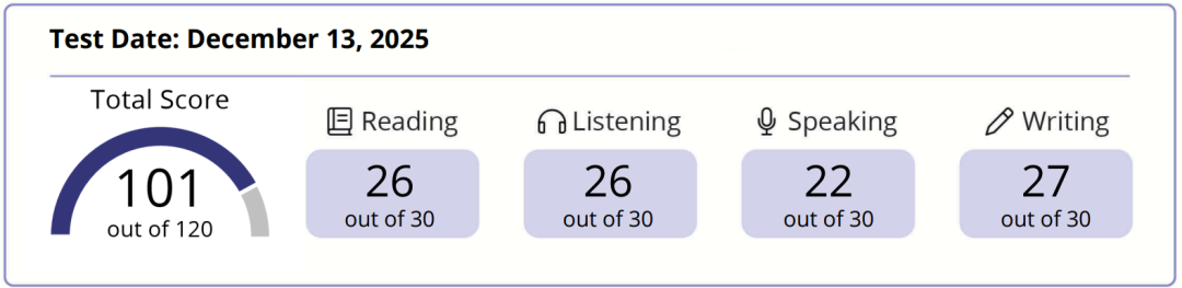 通过23个月的学习,25次正考,实现增分77分,托福正考从总分30到101分(最佳成绩107分)。