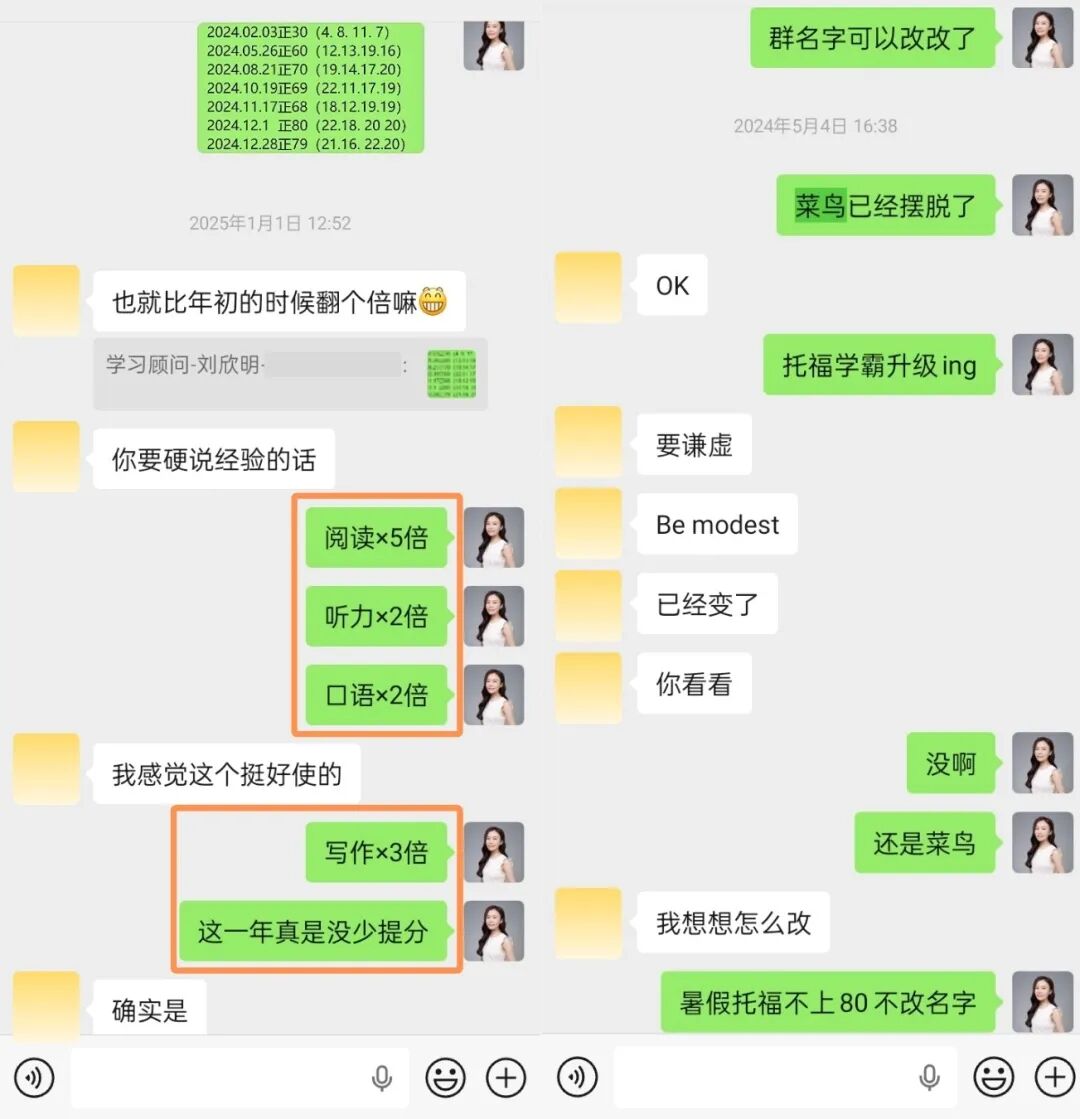 其次是鼓励的外化。在微信私信上,我对L同学的督促压迫和批评占大多数,这也是L同学后来才跟我讲,觉得我很多次都在“追杀”他。但是在微信学习群里,在众多跟盯督促和反馈中,我会适当穿插鼓励,给足他面子。作为学习指导师,我们必须学会发现并肯定学生的每一个进步点,因为我们太清楚,托福学习的提升之路,走得并不愉快,在浮躁的、急于求成的大环境下,能耐得住性子、塌下心来学习,本身已经很不易。而且托福成绩不会给你即时正向反馈,不是练了半个月、上了几次课、认真完成了几次作业,就能立竿见影、分数飙升,这是一场需要一年两年积累和打磨的持久战。“菜鸟”不是一天就蜕变成“学霸”的,而是逐步升级打怪的过程,所以,要给自己时间、也要给彼此信任。