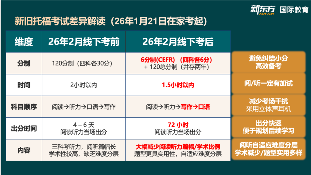 托福改革整体趋向低龄化、生活化,彻底打破“托福难考”的固有认知。我们有大量学员卡在老托福80分左右,通过仅一周的冲刺学习,就成功拿下新托福5分(对标老托福100分);更有老托福110分左右的教师,顺利斩获新托福6分(对标老托福118分)——无论你是中分段冲分,还是冲刺顶尖高分,新托福都能让你少走弯路、快速突破。