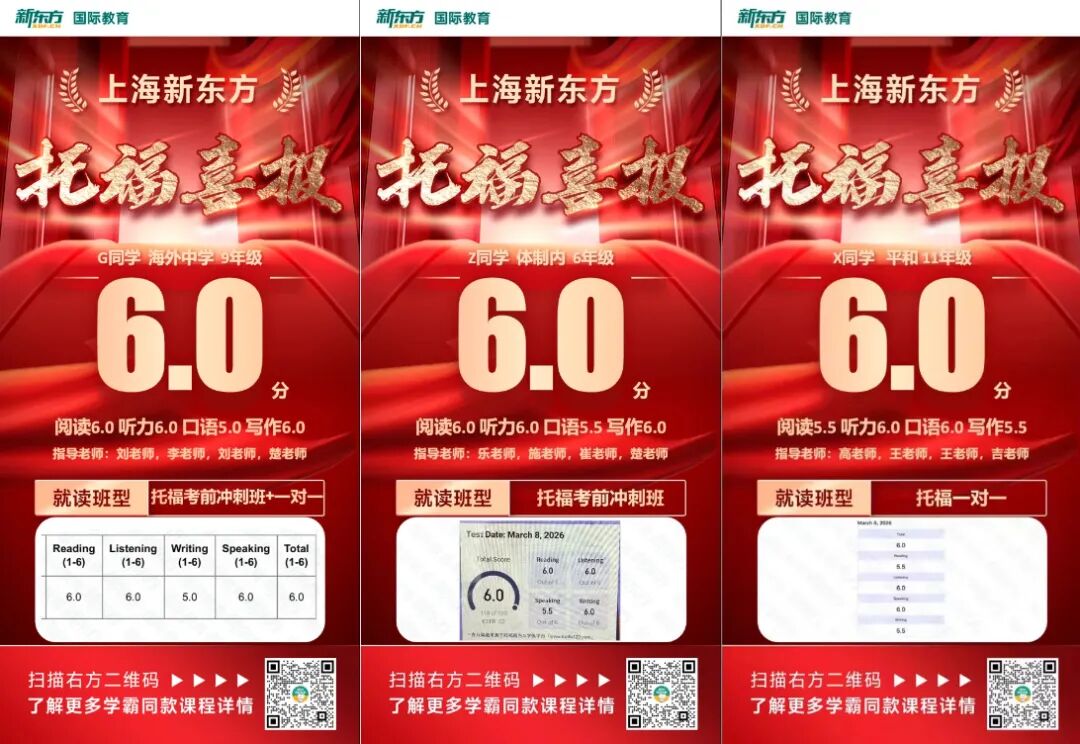 2月1日至3月14日期间,5场线下考试斩获3个6分满分、16个5.5分高分佳绩!实打实的成绩证明:新托福出分红利期已全面开启,此刻报考,高分易拿、真题高频、认可度拉满,正是省钱省时间、轻松冲分的黄金窗口!