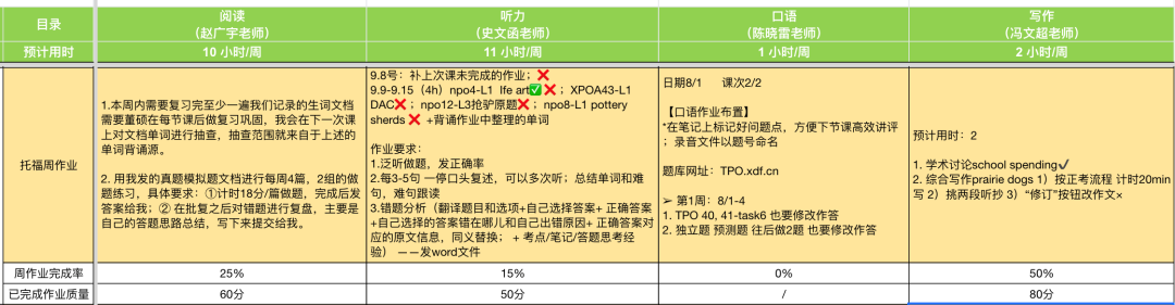 这样每周末来指导课进行复盘,以及针对性的查缺补漏,具体到每一篇作业,核查到位;把难度较高的或者是D同学不经意“掠过”的内容安排到指导课课完成,具体安排到每一小时的任务,限时完成,提高效率;