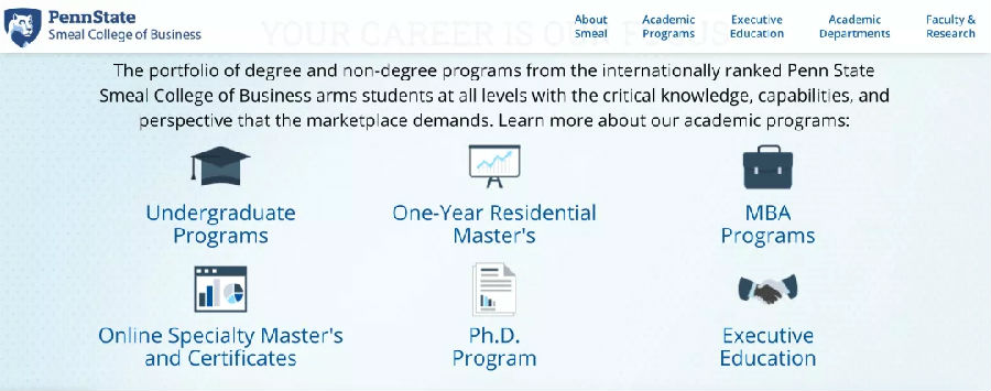 宾州州立大学斯米尔商学院成立于1953年,从创建至今培养了7万多名毕业生。学校提供本科及研究生学位课程的学习,共有6个主要研究方向:会计、金融、保险和房地产、组织管理、市场营销及供应链、信息系统。