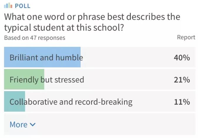 根据数据表明,大部分人认为该学校学生是才华横溢的,还有少部分人认为他们很友好容易合作但是压力很大。