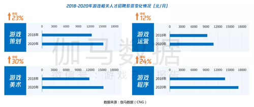 随着游戏行业的迅速发展,为了吸引和留住更多的人才,游戏相关岗位的薪酬也快速上涨,对比2018年和2020年的招聘薪资,美术、程序、策划的增幅上涨均超2成。