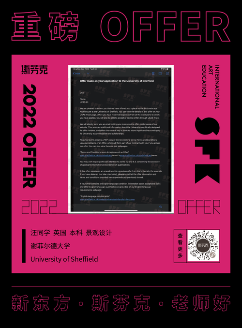 UCAS申请通道刚刚在9月初开放,很多同学还在准备申请的阶段,但斯芬克22Fall的汪同学,凭借3门A的A-Level预估成绩,在不到30天的时间里,早早的拿下了谢菲尔德大学景观设计和城市规划的本科直录offer!