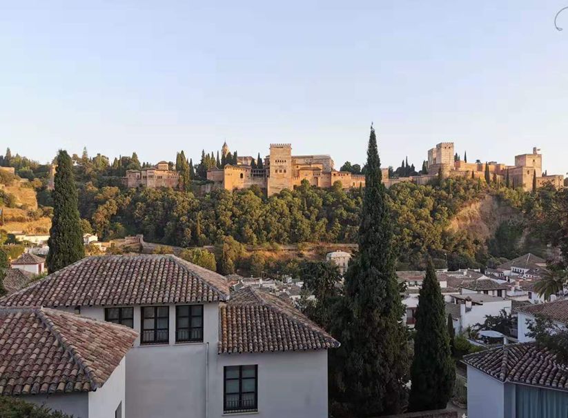女儿定了一个在古城小巷中的饭店,叫做Restaurante Mirador de Morayma。古城中的小巷太错综复杂了,我们转悠了半天才找着。饭店位置很好,从平台上能够看到对面的阿尔罕布拉宫,看到落日余晖为宫殿披上了一层柔和的色彩。宫殿发生过的各种生生死死的故事,早就随风远去。今天的人们来到这里,没有任何历史的沉重,很少有人再去探究这里曾经发生过什么。穿街走巷之间,人们只是为了寻找更加轻松的生活。