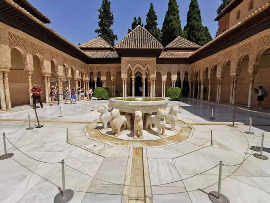 皇宫里终年流水不断,所有庭院里都有喷泉涌出。其实这一流水是从南边三十公里之外的内华达山脉,通过引水渠引流过来的。内华达山是西班牙南部的最高山脉,3000多米高,一到冬天就白雪皑皑,是欧洲南端的最高峰,也是西班牙冬天最南端的滑雪地。山中水资源丰富,摩尔人就模仿古罗马人,用引水渠把水引入城市和皇宫。水在进入皇宫后,先流入一个储水池。储水池里养着几只乌龟,如果有人往水里投毒,乌龟就会死掉,这样确保皇宫里的饮水安全。现在储水池已经废止,但从山上下来的流水,依然淙淙不息。