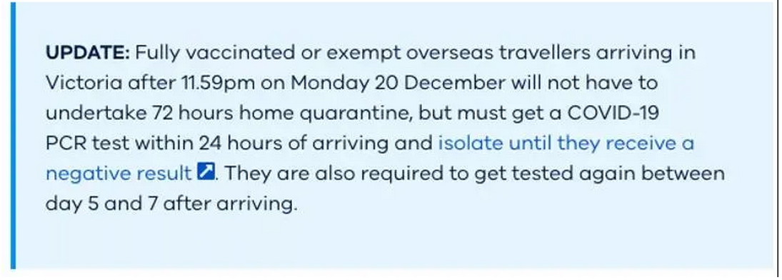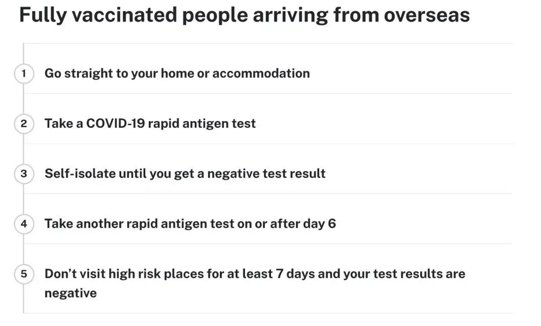 从2021年12月21日起,维州不再强制72小时居家隔离。抵达维州后的24小时内做 COVID-19 PCR 核酸检测或快速抗原检测试 RAT,直到收到阴性检测结果即可解除隔离