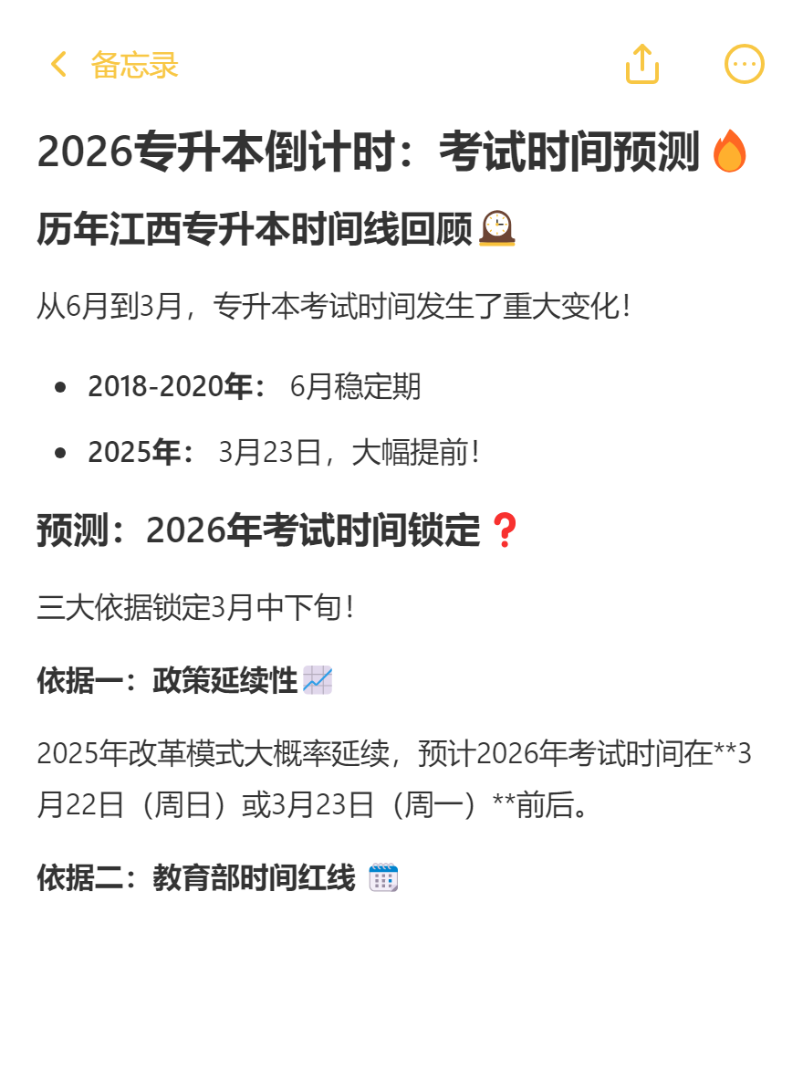 综合历年数据、政策导向及实操逻辑,2026 年江西专升本考试时间大概率锁定 3 月 22 日(周日)。考生需以 “3 月 23 日考试” 为基准倒排计划,重点关注 2 月报名、3 月冲刺两大黄金节点,同时通过省教育考试院官网保持政策信息同步。记住:科学的时间规划 + 精准的政策解读,就是击败 50% 竞争对手的关键武器!