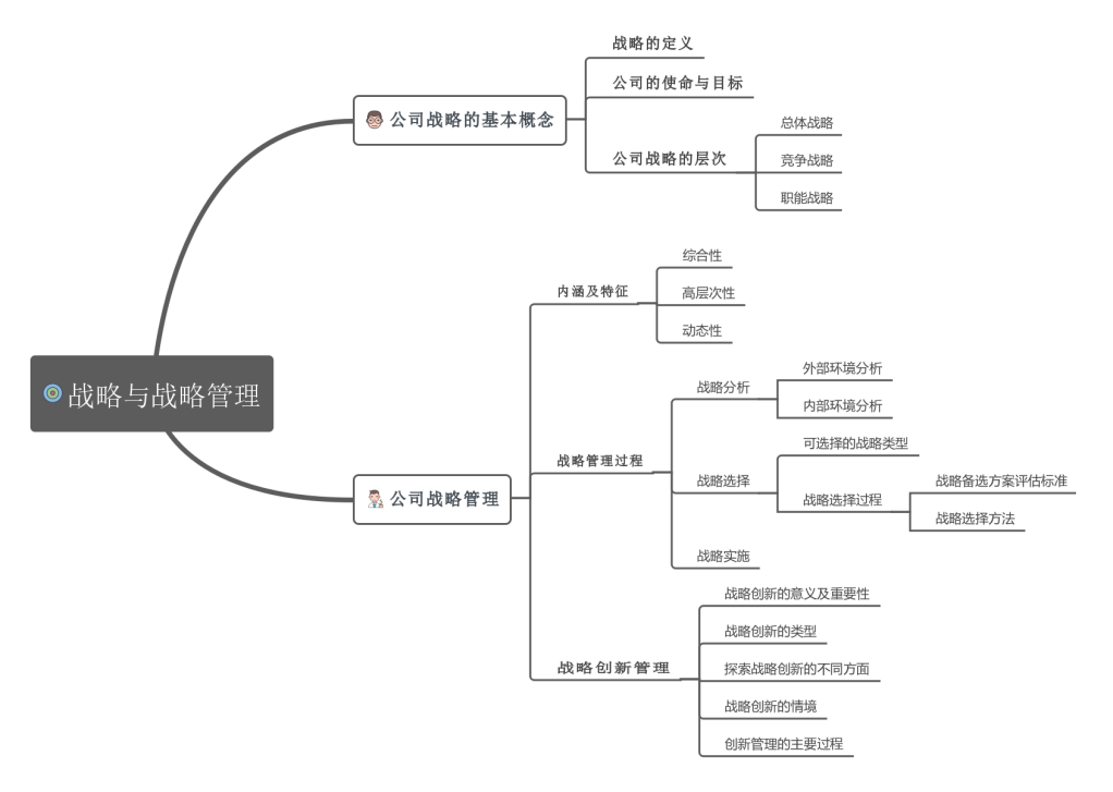 战略管理——定义、使命、目标和创新(第一章)2—6分 战略分析——外部和内部环境(第二章)12分—20分 战略选择——(第三章)45—50分 战略实施——(第四章)7—12分 |