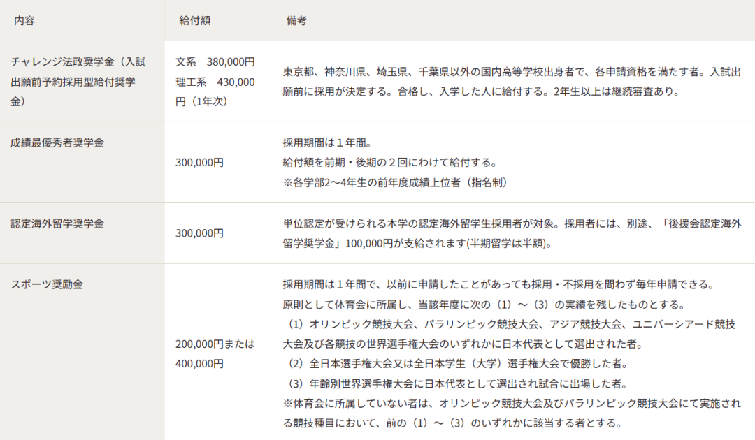 发放金额:2-25万日元/月,有的类别还会以学费、生活费、宿舍补助费、国民健康保险补助、交通乘车补助、图书券等方式提供奖励