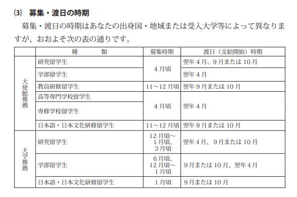 申请时间:大使馆推荐:4月、11-12月;大学推荐:1月、3月、6月、12月-次年1月