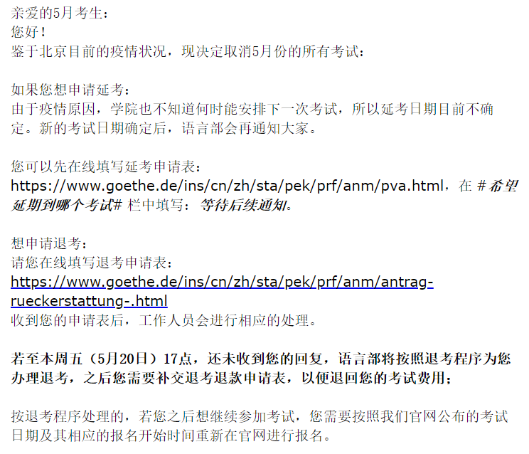 歌德考试院今日(5月17日)发布邮件通知,受北京疫情原因,歌德学院北京分院5月考试全部取消。视疫情情况再择机举行,考生可申请延考或退考。立即咨询>>
