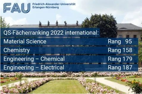 在Material Science and Engineering(材料科学与工程)、Chemistry(化学)、Chemical Engineering(化学工程)领域,德国埃尔朗根-纽伦堡大学均跻身Top200。其中材料科学与工程专业排名全球第95位,德国第5位。