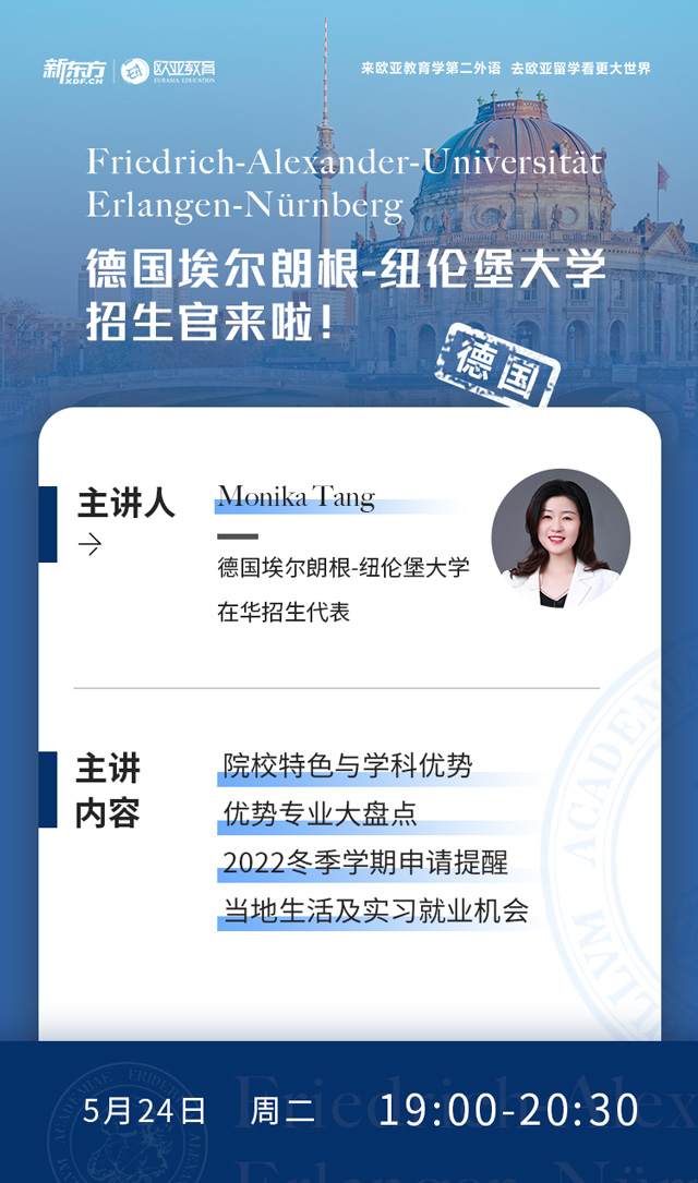 那么除了前面提到的QS排名榜上有名的专业外,埃尔朗根-纽伦堡大学还有哪些优势学科呢?2022/23冬季学期,纽伦堡大学的申请发生了哪些变化?又有对中国留学生来说的利好政策呢?在当地生活是什么样的体验?怎样能够高效寻找到实习就业机会?立即咨询>>