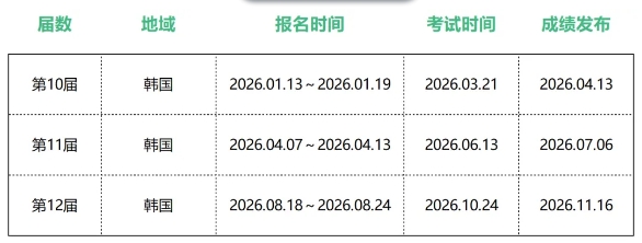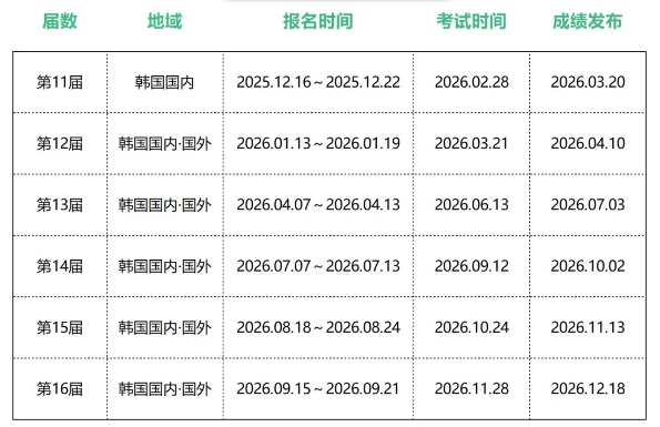*以韩国国内为基准,国外报名时间根据当地考试机关情况而定;
