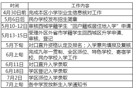 西城区2021年初中入学工作时间安排表