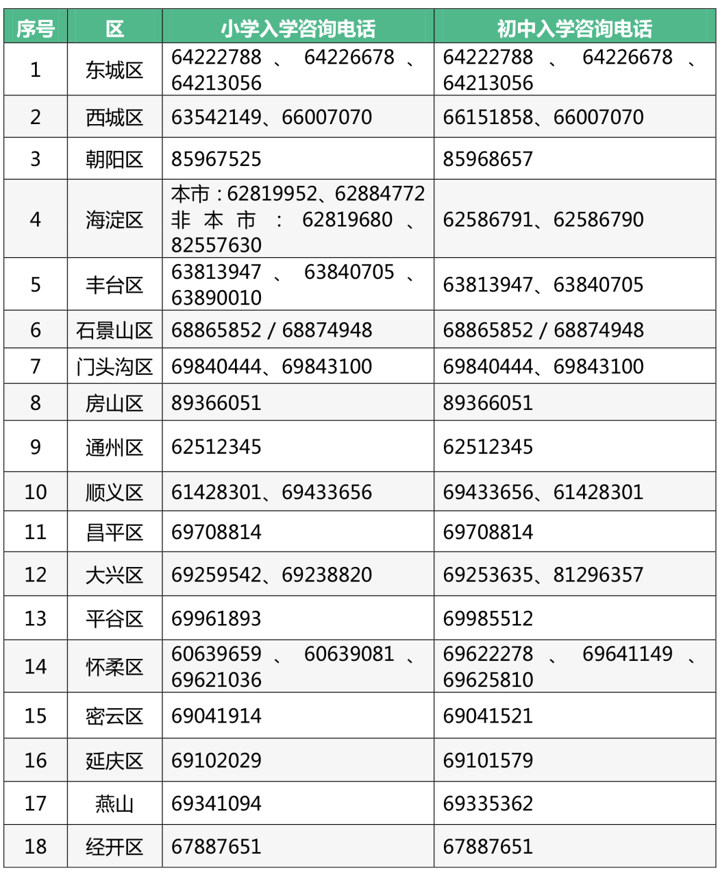 2021年北京幼升小:义务教育阶段入学工作各区咨询电话