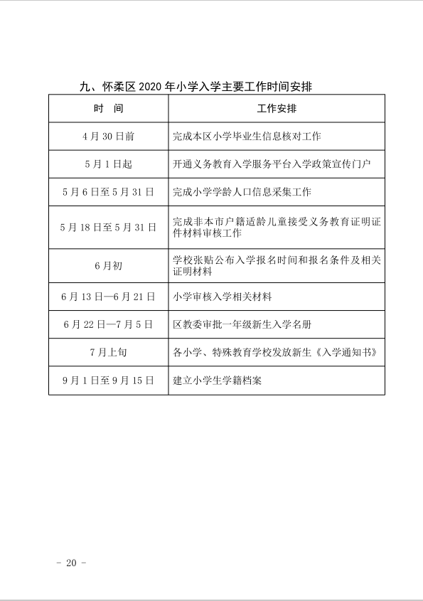 2020年怀柔区义务教育阶段入学工作日程安排表