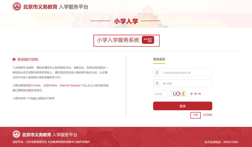 3.进入“小学入学服务系统”登录页后,点击“注册”。